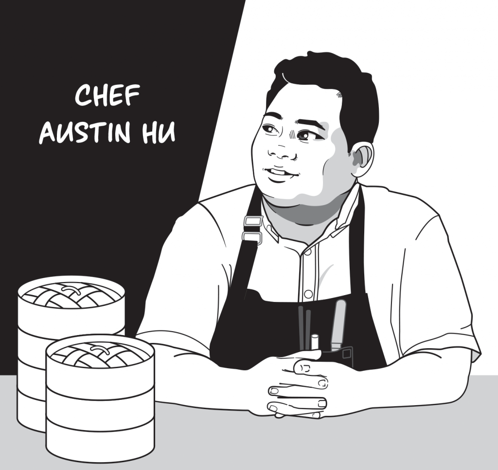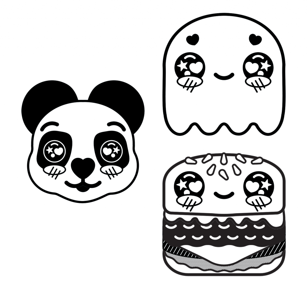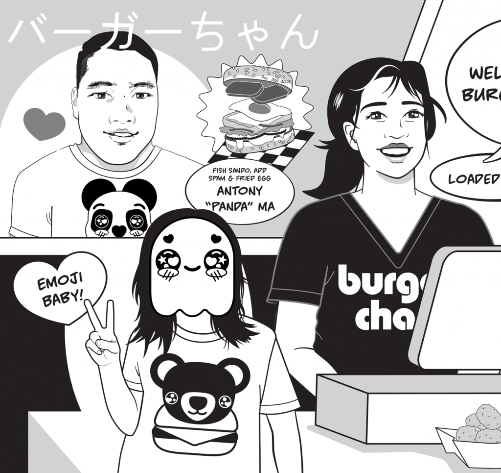 Wall 1 IllustrationWall 1 Detail A, IllustrationWall 1 Detail B, IllustrationChef Austin Hu portrait, Wall 2Burger Chan Mural, painted.Maneki-Neko illustration also adapted to simple linework for a coloring page for the kids’ menu.Bonus illustrations for “Emoji Baby”, Diane and Willet Feng’s daughter who always has an emoji over her face on social media.
