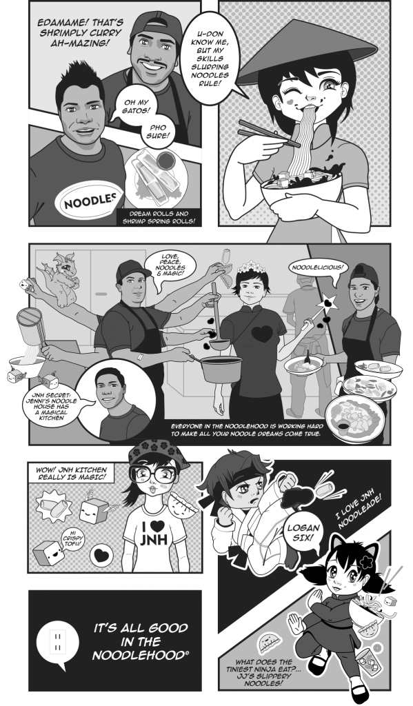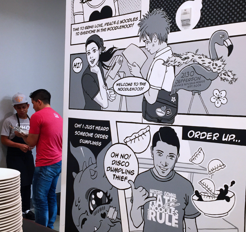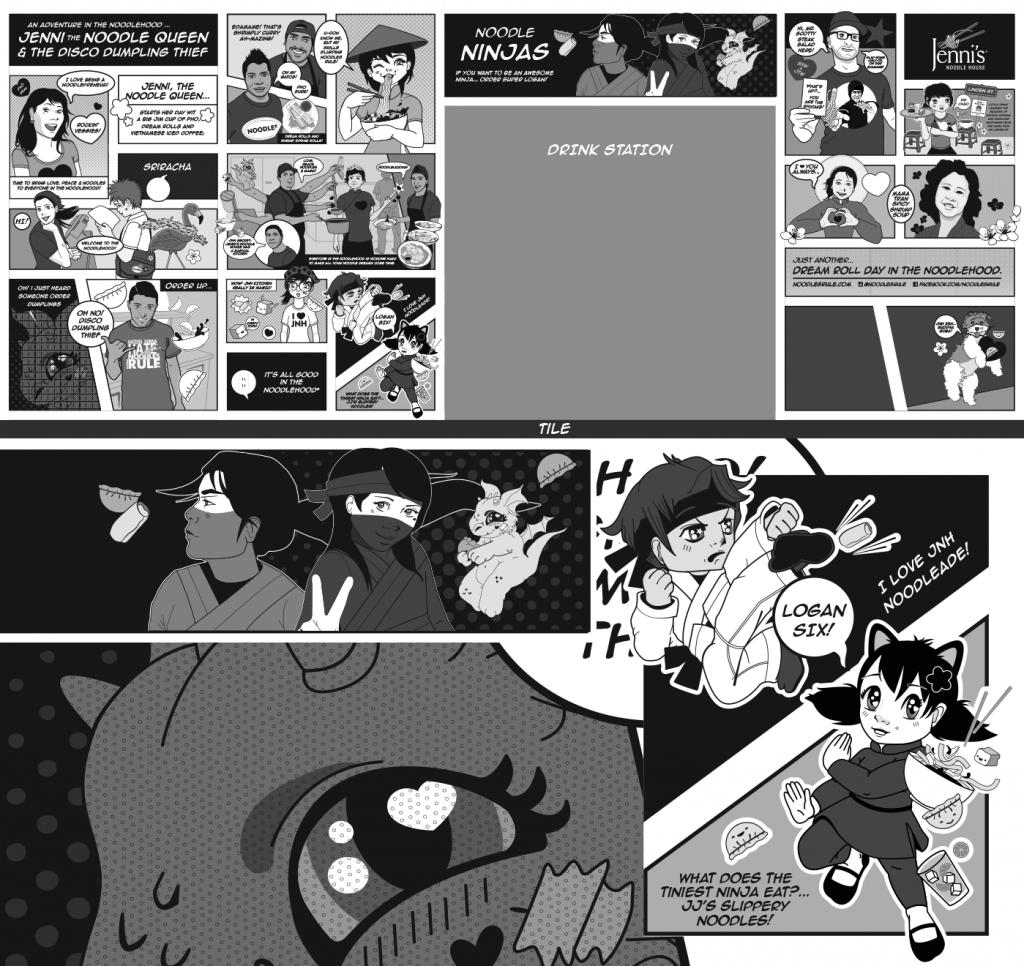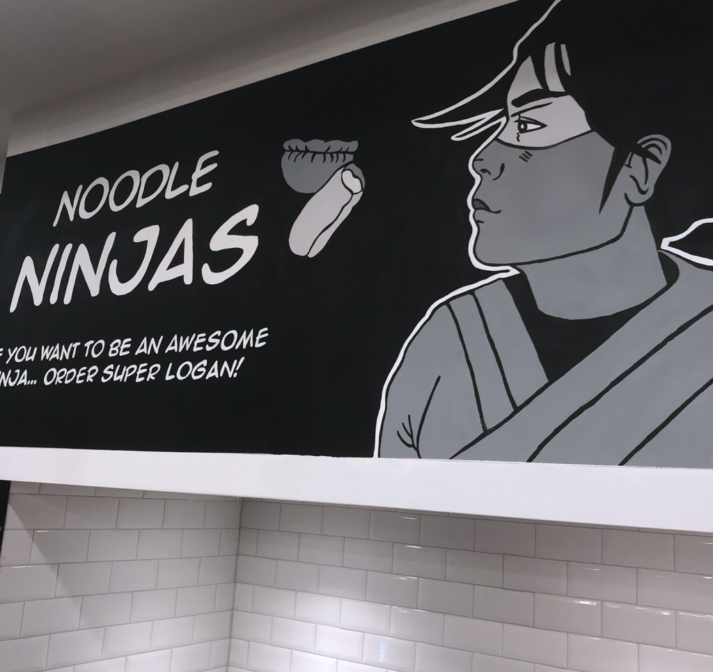 The top illustration is the full span of the mural including spaces for drink station and condiment area/ flex space. Below are some more detailed close up of illustrations. The location closed after a little over a year. Wall One section AWall 1 Section BNoodle Ninjas Wall 2 above drink and condiment stationWall 3Painted Wall 1 A Details in JNH Greenway location (closed 2018)Painted Mural wall 2 and 3 at special HRC eventDetail of Wall 3, Mama Tran portrait. Art Car Curry in foreground.Detail of Logan the original Noodle Ninja, wall above drink station