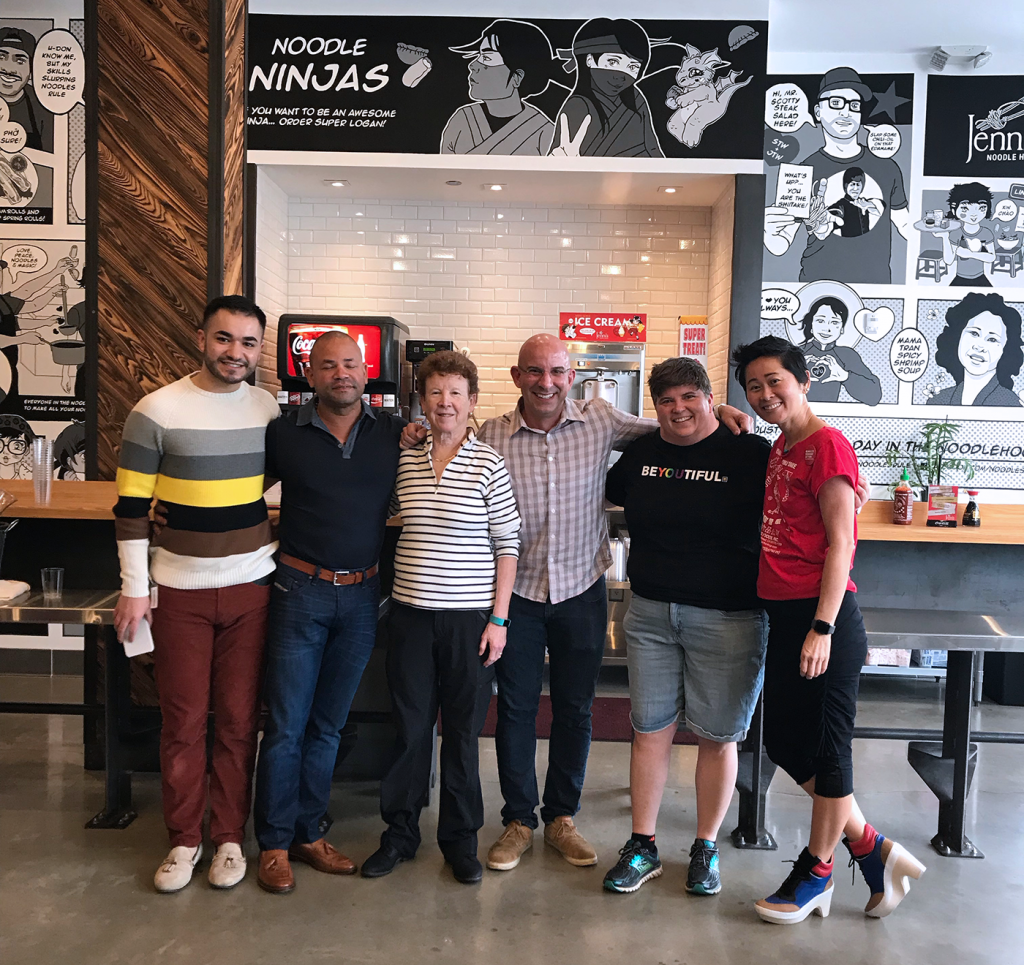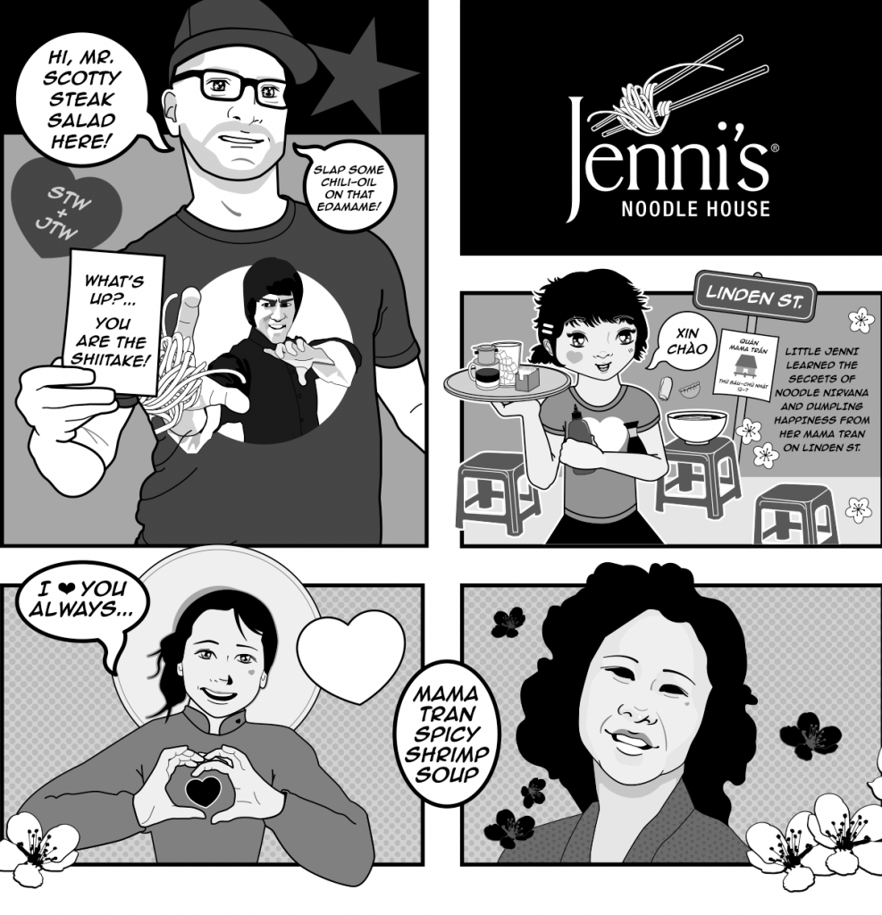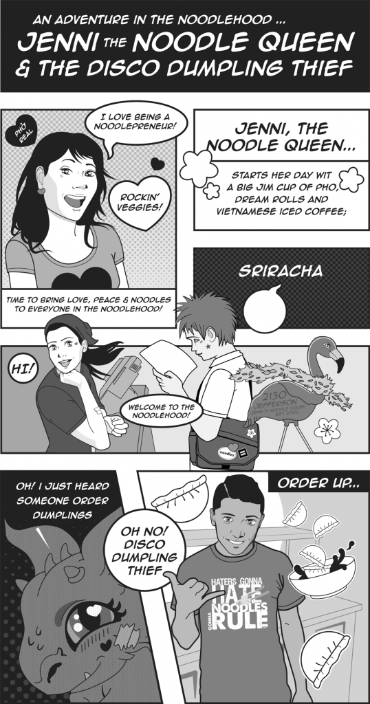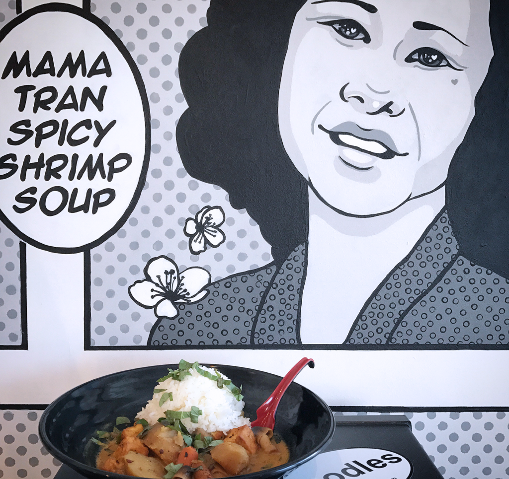 The top illustration is the full span of the mural including spaces for drink station and condiment area/ flex space. Below are some more detailed close up of illustrations. The location closed after a little over a year. Wall One section AWall 1 Section BNoodle Ninjas Wall 2 above drink and condiment stationWall 3Painted Wall 1 A Details in JNH Greenway location (closed 2018)Painted Mural wall 2 and 3 at special HRC eventDetail of Wall 3, Mama Tran portrait. Art Car Curry in foreground.Detail of Logan the original Noodle Ninja, wall above drink station